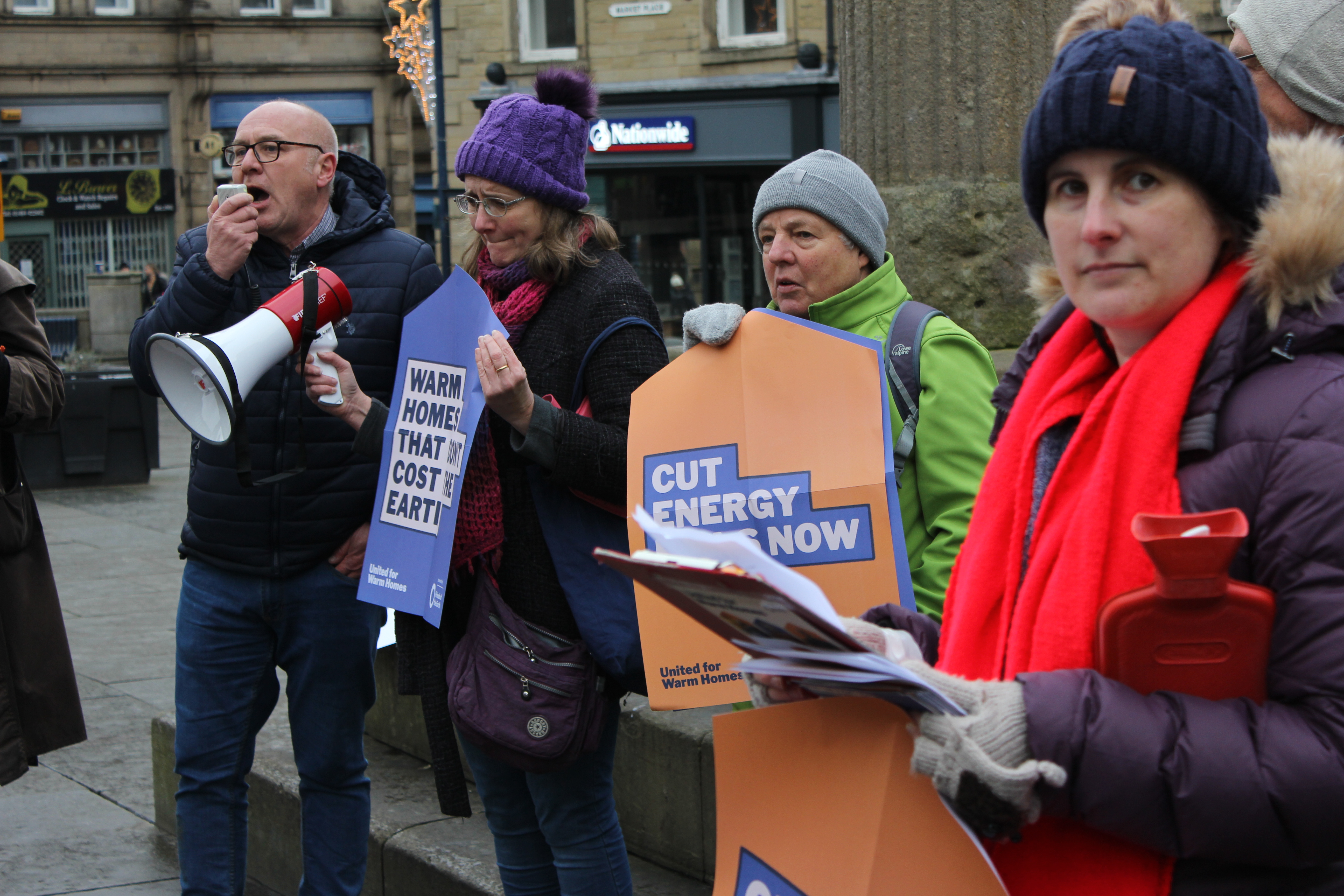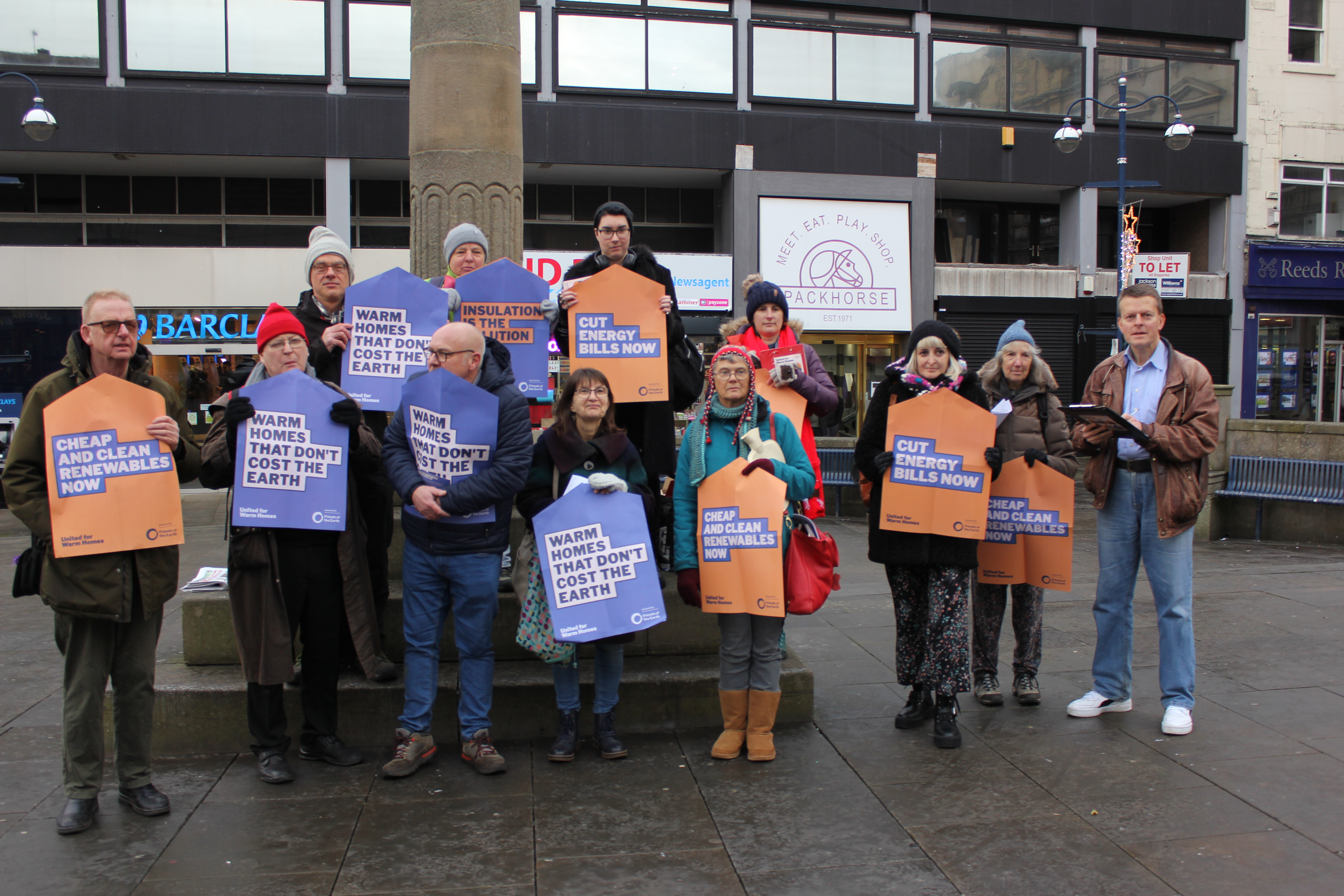 A solidarity action was organised by Huddersfield Friends of the Earth as part of its local ‘United for Warm Homes’ campaign. The action took place in Market Place in Huddersfield, with speeches and a solidarity photo stunt. Attendees were asked to bring warm hats, gloves, scarves, and hot water bottles to be part of that.