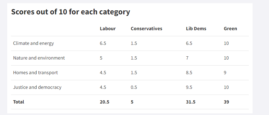 The 2024 election manifestos of Labour, the Conservatives, the Liberal Democrats and the Green Party have been ranked against 40 key policies. Friends of the Earth and Greenpeace have joined forces to rank political parties’ manifestos ahead of polling day on 4 July.