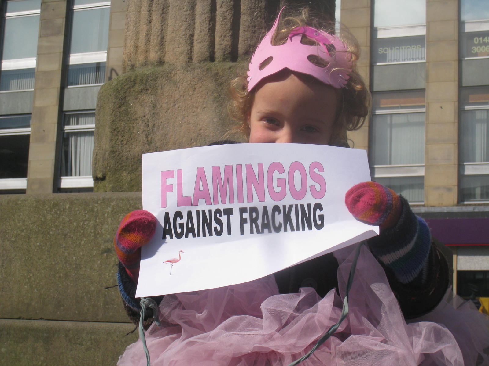 The action took place outside Barclays Bank branch in Market Place, Huddersfield this Saturday 18 April. Barclays customers and passers-by were encouraged to write to the Chief Executive of Barclays Bank to oppose the fracking plans in North Yorkshire and also to consider moving their bank account to a fossil free alternative like Nationwide and the Co-op Bank. Children also took part in the action dressed as ‘Flamingos against Fracking’ highlighting the proximity of some of the proposed fracking sites to the Flamingo Land theme park.